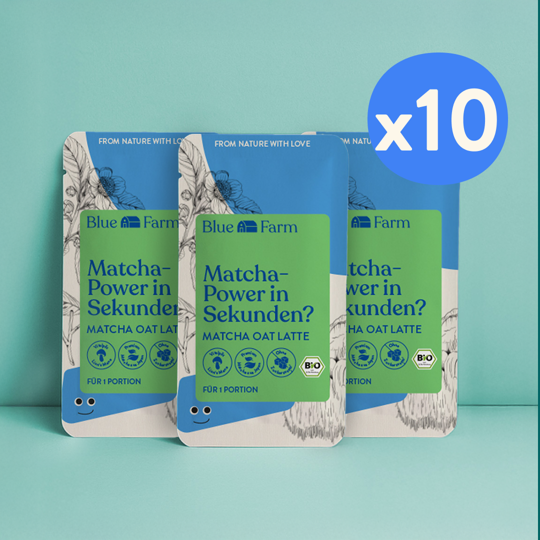 Matcha Oat Latte: Bio-Haferdrinkpulver mit Bio-Matcha und Lion's Mane. 24 g. Entspricht 200 ml Bio Matcha Latte. Pflanzlich. Laktose- und sojafrei. Ohne Zuckerzusatz¹. Hergestellt in Deutschland.