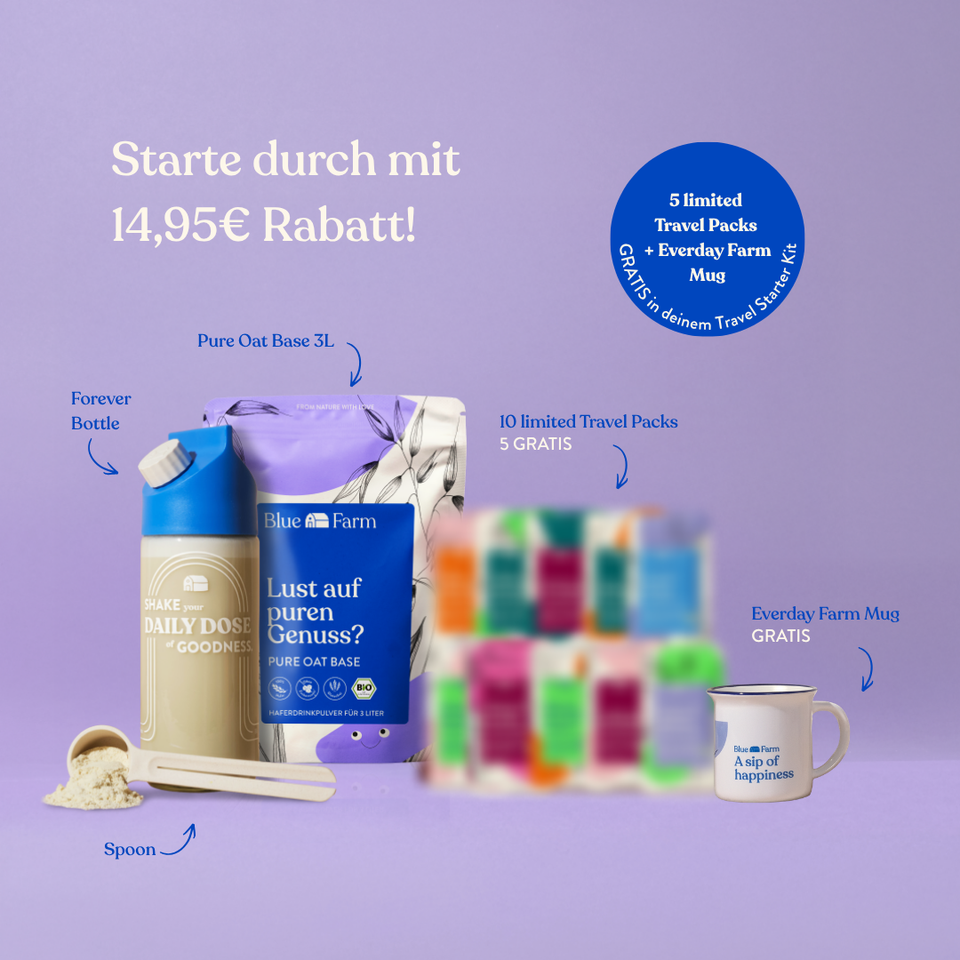Entdecke Blue Farm in seiner ganzen Vielfalt. Pure Oat Base 3L für den Alltag – und fünf cremige Flavour Sachets zum Ausprobieren: Pure, Matcha, Chai, Kakao, Vanille. Alle aus Bio-Hafer, ohne Öl, ohne Industriezucker, ohne künstliche Aromen. Sachet auf, Wasser rein, shaken. Fertig.