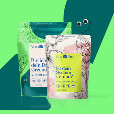 26 % Fruchtpulver und -extrakte (Apfel-*, Mango-*, Ananas-*, Bananen-*, Kokosnusswasser-* und Lucumapulver*, Acerola Extrakt*), 21,3 % Gemüsepulver und Algenmischung (Spinat-*, Karotten-*, Grünkohl-*, Spirulina-*, Chlorella-* und Rotalgenpulver Lithothamnium Calcareum*), Hafer* (fermentiert), Proteinmischung (Kürbiskernprotein*, Sonnenblumenprotein*), Inulin*, Adaptogen-mischung (Maca*, Moringa*, Chaga Extrakt*, Cordyceps Extrakt*), Hafer-Beta-Glucan*, Ingwerpulver*, Süßholzwurzelpulver*, Kurkuma*, Verdickungsmittel: Guarkernmehl*, Natriumcarbonat